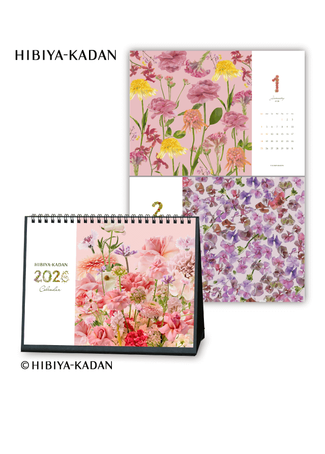 カレンダーの「月」部分には、新鮮なお花を一つひとつ丁寧にならべ自然体にこだわって作成したお花屋さんならではのFlower Letteringを使用。見た目の華やかさだけでなく花やみどり自体が持つ「季節感」や「生命感」などにメッセージを感じながら、自分だけのオリジナルフラワーカレンダーを作ってみてはいかがでしょうか。-HIBIYA-KADANロゴ入り-