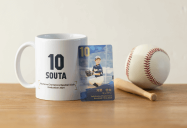 チームロゴや背番号、集合写真などを入れることができるマグカップ。そのまま記念品としても使える専用ボックスと特別なスリーブ付き。フォトブック「THE BEST TEAM」「BestTeamForever」とおそろいのデザインもおつくりいただけます。